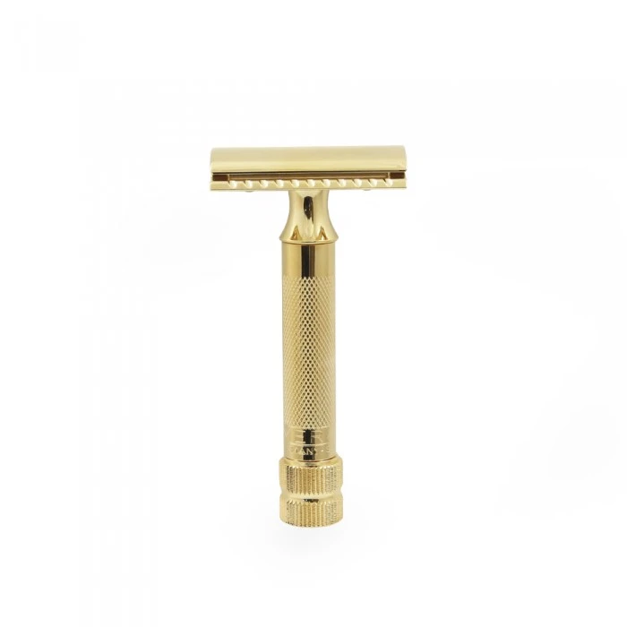Merkur 34G Gold DE Safety RazorĀ is a gold plated double edge safety razor in one of the most popular Merkur designs, the 34C. Its gold plated handle features knurled engraving for improved grip. The razor head, collar and end cap are also finished with polished gold. Also features engraved Merkur branding at the base of the handle. This is a two piece razor where the top plate can be separated for easy blade insertion and razor maintenance.
