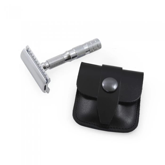 Merkur 933C Travel Razor in Leather Case is a chrome plated double edge safety razor perfect for travel. Its polished chrome handle is features fine knurling for enhanced grip and an attractive finish. The razor head and collar are also finished with polished chrome. This is a four piece razor where the top plate and base plate can be separated for easy blade insertion, and the handle breaks down into two pieces. All of the component parts fit neatly into a pop-stud fastened leather travel pouch which fits neatly into any washbag. A smart, stylish, portable razor offering the famous Merkur shave.