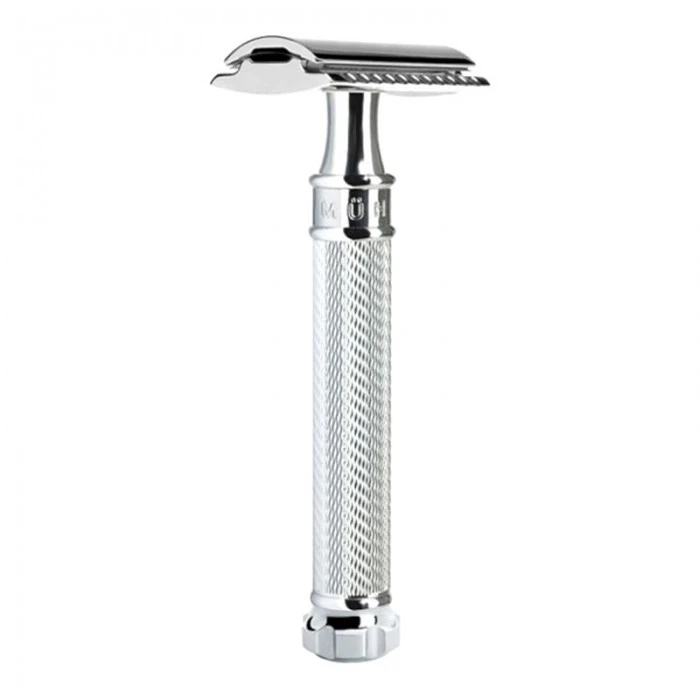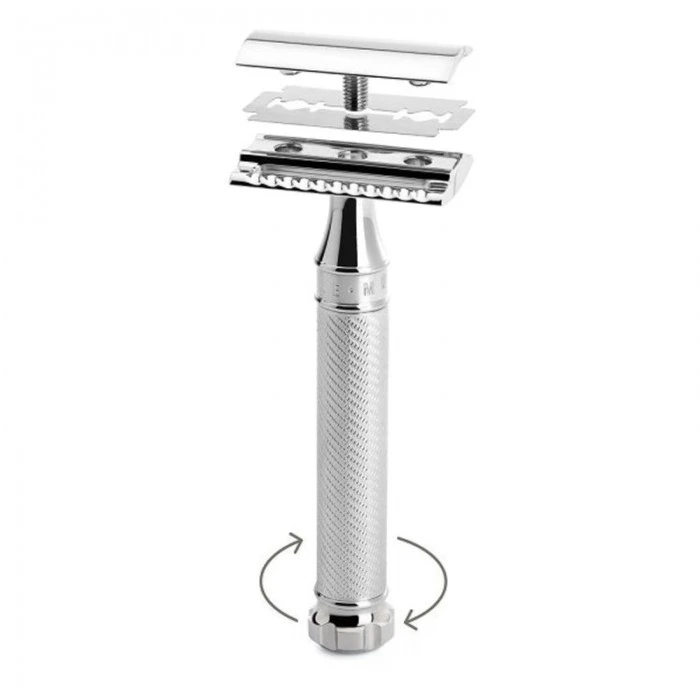 This two-piece razor features a handy twist function that releases the cap with a simple twist of the small wheel at the end of the handle. The bottom plate of the head remains firmly attached to the handle, whilst the top plate will become detached. This allows used blades to be removed safely and replaced with new ones and makes the cleaning process easier. This is a fresh take on the original Muhle R89 Chrome DE Safety Razor (Closed Comb).