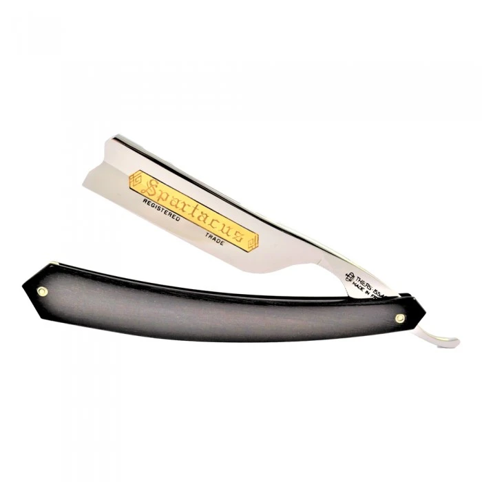 Thiers Issard Luxury Singing Hollowed ‘Spartacus’ Ebony 7/8 Straight Razor is a ‘singing’ hollowed hook nose straight razor made from 100% carbon C135 steel. The one side mirror polished, one side satin polished 7/8″ blade features hand-applied gold leaf branding of the ‘Spartacus’ mark. The real ebony wood handles combined with Thiers-Issard branding on the side and anti-slip knurling on the underside of the tang make this a luxurious, classic straight razor.